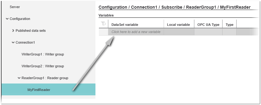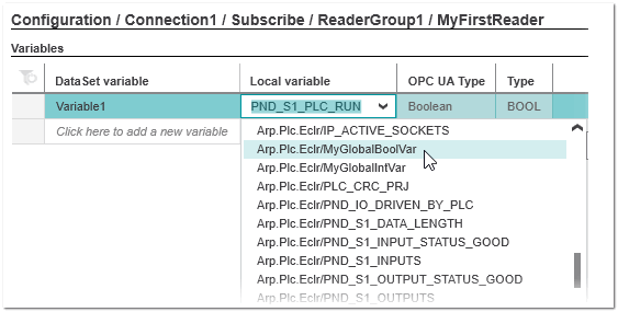 Since the configuration of publishers and the subscribers takes place in different projects, there can be no automatic check for these rules. When configuring the reader, you must ensure that the necessary information on the values contained in the subscribed data set is available and considered.According to the defined mapping, the reader will receive the values contained in the specified data set in the defined publishing interval from all writers specified by the Publisher ID and Writer group ID.You can change the order of the inserted variables by dragging & dropping them within the table: Click on an entry in the row header and hold down the mouse button while moving the mouse.- In the 'Variables' table on the right, click into the empty 'DataSet variable' field.