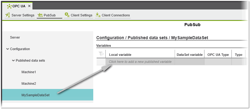 In addition to manually adding a new data set as described in the following procedure, you can also import a data set assigned to a reader or writer group from an external PubSub configuration of a remote OPC UA server. See the topic "Importing External PubSub Configurations from Remote Servers" for details. |