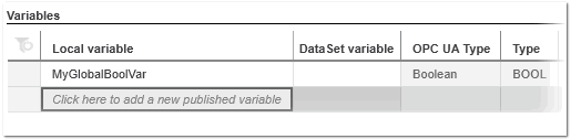 When adding a port/variable, the 'OPC UA Type' (built-in data type acc. to the OPC UA specification) and 'Type' columns are automatically filled (both values are read-only). The 'Type' column shows the data type of the selected variable declared in the project. The 'OPC UA Type' shows the OPC UA data type used by the server to store the value of the variable. The optional 'DataSet variable' value is used as published alias name of the local project variable.