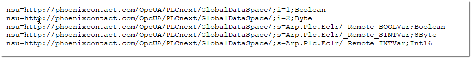 s=Arp.Plc.Eclr/_Remote_BOOLVar'Browse path' Read-only information on where the variable is located on the OPC UA server. The information is provided by the server. 'Remote variable namespace' Namespace to which the node representing the OPC UA server variable belongs.Example: http://phoenixcontact.com/OpcUA/PLCnext/GlobalDataSpace/
