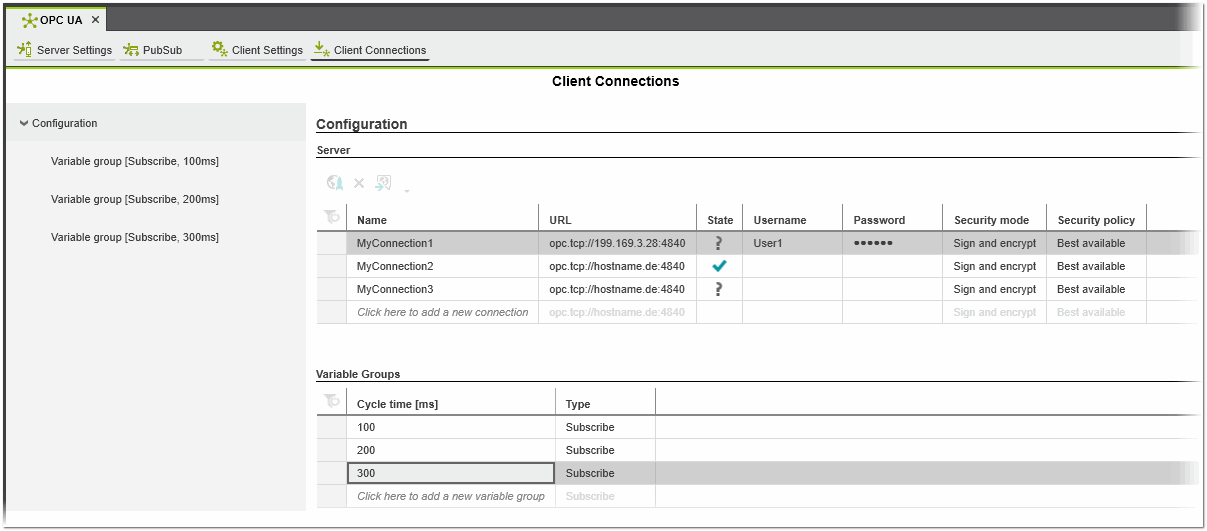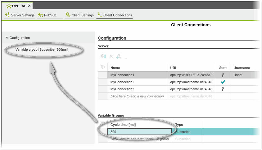 - In the 'Variable Groups' table in the 'Client Connections' editor, click into an empty cell in the 'Cycle time' column and enter a cycle time value (value must be greater or equal to 1). In the 'Type' cell, select the group type ('Subscribe' or 'Write').When you confirm the cycle time value, the new variable group appears under the 'Configuration' category on the left in the editor (see the following example). The group name shows the configured group type and cycle time. To delete a variable group from the 'Variable Groups' table, click in the first table cell and press <Del>.