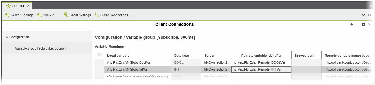 | Name | Name that identifies the server connection that is used for the data exchange. The connection must be specified for each variable mapping you create (see the "Mapping variables in PLCnext Engineer" section below). | ||||||