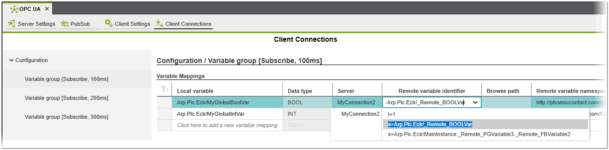 In the 'Variable Groups' table, the group type ('Subscribe' or 'Write') and the cycle time (update interval in ms for a cyclic write or subscribe) are specified. The variable groups are used to organize the variable mappings (see the section "Mapping variables in PLCnext Engineer" below) . The variable mappings contain a local variable and a description how to find the remote variable made available by the OPC UA server. A variable group can contain one or more variable mappings.
