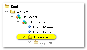 In the 'Files system' category of the 'Server Settings' editor, you can specify the access to the (Linux) file system on the PLCnext Technology controller by OPC UA clients. This means OPC UA clients can use OPC UA standard mechanisms to access data on the controller file system via the OPC UA server embedded on the PLCnext Technology device. This way, for example, log files can be read from the controller by an OPC UA client or any other information which has been written to the file system by the controller application using FILE function blocks.