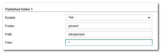 The settings define which folders and files of the controller file system will be visible (published) to OPC UA clients in the OPC UA information model.