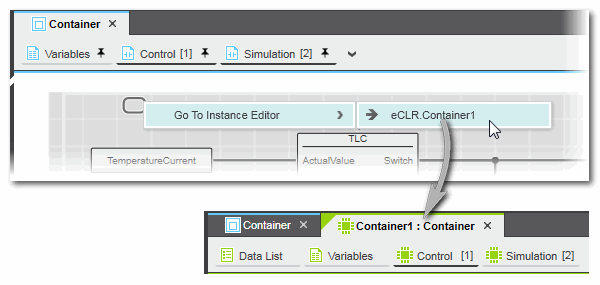 To select an instance, right-click in the POU editor, select 'Go To Instance Editor' from the context menu and click the desired instance. Note that this is only possible in code worksheets but not in variable tables. After selecting an instance, two tabs of the editor are visible: offline as POU type (blue color marking) and online as instance (green color marking). Refer to the following example.