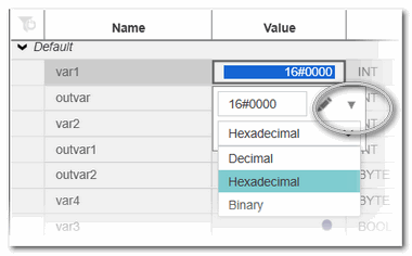 The default value format for the display of online variables in debug mode can be set via the 'Options' dialog.