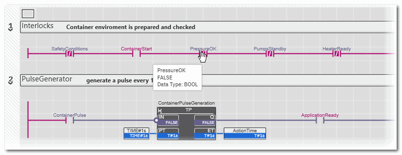 The online values are shown in all online worksheets and tables in different colors according to the variable state read from the controller. Additionally, the tooltip shown when hovering the mouse pointer over an object or variable displays the current value.