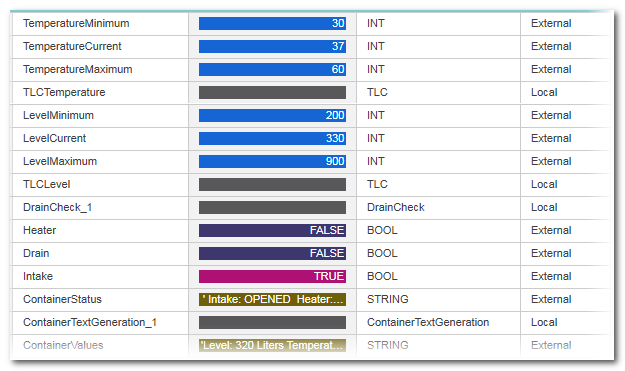 | Variables grids, Data/Port Lists | The online value of a code object is shown in a separate 'Value' column. The context menu provides commands to add a variable to the WATCHES window and to force/overwrite it. Online values of ports in local variables tables and in the GDS Port List are shown in the same representation like IEC variables. |