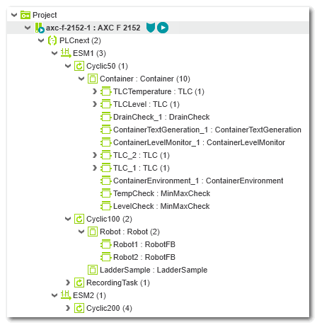 Alternatively, you can open a POU instance from the PLANT in debug mode by double-clicking the related instance icon. The instance icons are contained under the 'PLCnext' node. Refer to the example below.