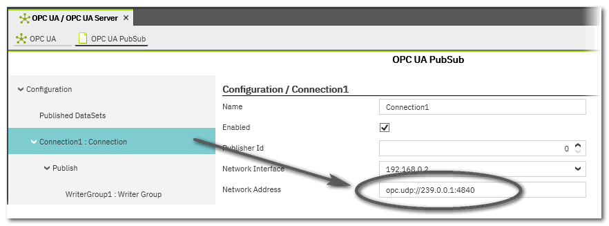 In the configuration of the OPC UA PubSub communication, an invalid network address is specified in the properties of a connection. This Multicast address specifies the network to which each writer contained in the particular connection publishes its data values.