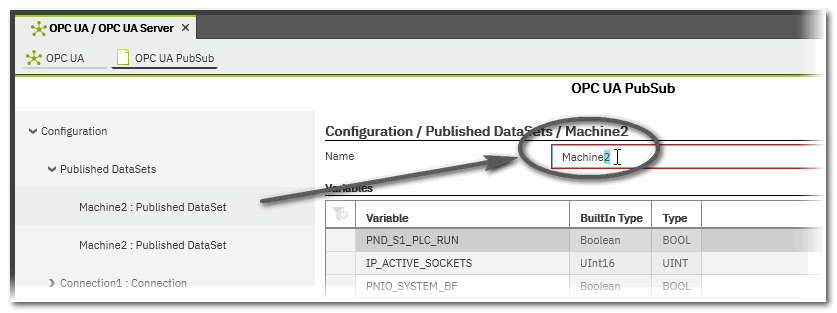 In the configuration of the OPC UA PubSub communication, multiple data set names are specified. Within a configuration, data set names must be unique.
