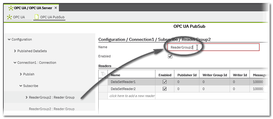 In the configuration of the OPC UA PubSub communication, multiple reader group names are specified. Within a configuration, the reader group names must be unique.