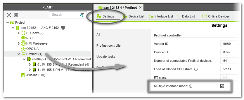 In PLCnext Engineer, the multiple interface mode is automatically activated if these conditions are met. This is shown in the 'Settings' editor of the Profinet Controller. Here, the parameter 'Multiple interface mode' is set. You can deactivate and reactivate it manually as required.