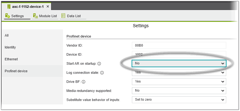 In the 'Device List', Profinet devices which support / do not support Profinet S2 redundancy can be added. By default, the 'Start AR on Startup' parameter for all Profinet devices instantiated in the PLANT is set to 'No' (see the description of the "Applicative System Redundancy (ASR)" below).