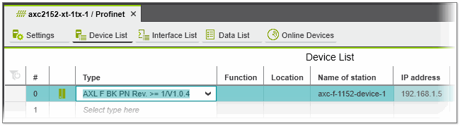 Double-click the 'Profinet' node in the PLANT and select the 'Device List' editor in the editors area. Left-click into the 'Type' list box and use the role picker to select the desired device.
