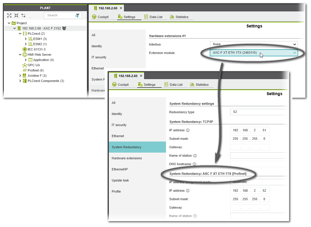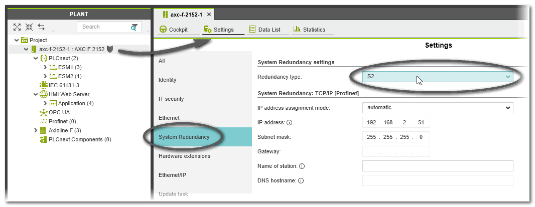 The following steps describe how to enable Profinet redundancy for the controller contained in the PLANT, how to configure the network settings of the redundant controller, and how to configure your Profinet network/hardware via the PLANT.