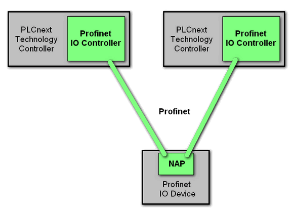 SR S2 requires two Profinet controllers and Profinet devices that provide at least one Network Access Point (single NAP). Both controllers use the same configuration data for accessing Profinet devices. They connect to the same submodule of the connected devices. This means that the controller is redundant but not the device access point.
