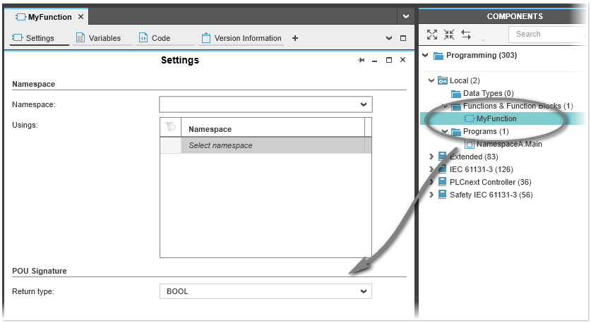 PLCnext Engineer supports namespaces for standard function POUs (not supported for safety-related function POUs). Namespaces allow you to organize and group POUs to make them unique within the project. They help you to ensure that the POU names do not collide with other names within the PLCnext Engineer project.