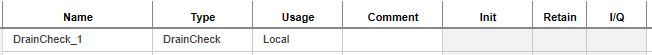 In the variables table of the calling POU, an instance name has to be declared. In the following example, DrainCheck_1 is the name of the DrainCheck FB instance.