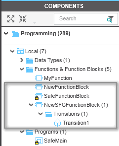 You can create safety-related user FBs in the 'Programming' category of the COMPONENTS area for a safety-related application if a Safety PLC is available in the project.