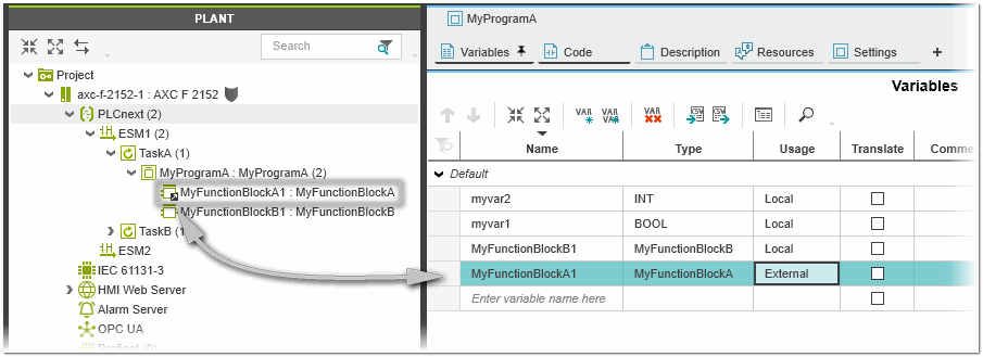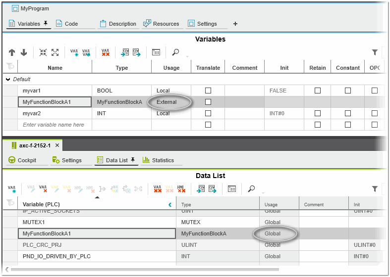 A function block with the 'Usage' 'External' in the variables table of the calling POU or the 'Usage' 'Global' in the Data List generates a global function block. (Declaring an external function block in the variables table of a POU leads to an automatically generated global function block in the Data List.)
