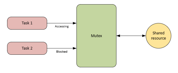 To ensure that only one task can access the shared data at a time, a mutex is used. The mutex is a locking mechanism that: