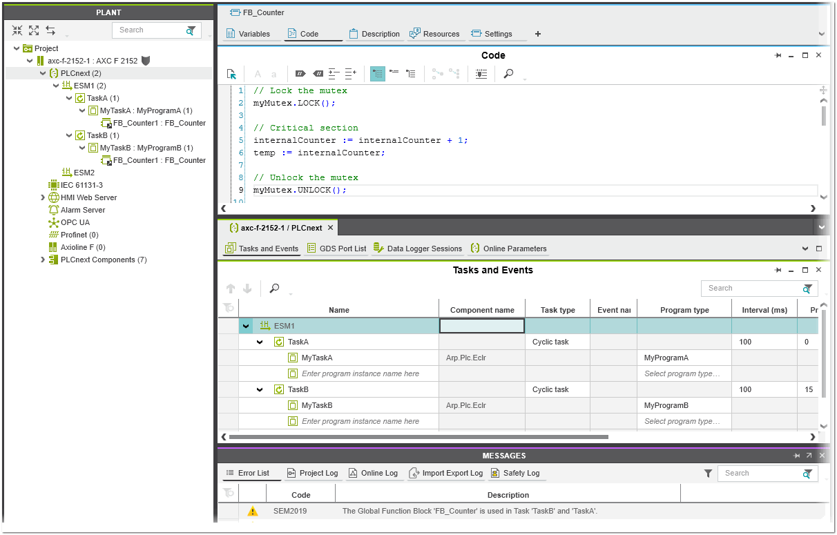 In the following example, the global function block FB_counter uses a mutex to protect the access to the shared variable internalCounter. An instance of FB_counter is used in the programs MyProgramA and MyProgramB. MyProgramA is called from TaskA and MyProgramB from TaskB. With help of the mutex, it is ensured that only one call can update (increment) the internalCounter at a time. Once the counter is incremented, the mutex is unlocked, allowing the next waiting task to access the shared variable.