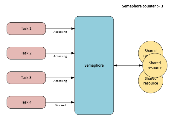 • If the maximum number of permitted tasks that are allowed to access the semaphore is reached, the tasks waits (task is blocked) until a resource becomes available.