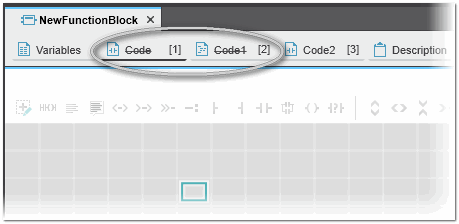 | 'Deactivate Build of all Code Worksheets' | Excludes all code worksheets of the POU from the build process. All editor tabs of the code worksheets are displayed strikedthrough and the worksheets are in read-only mode. The command is not available if all worksheets are already deactivated. |