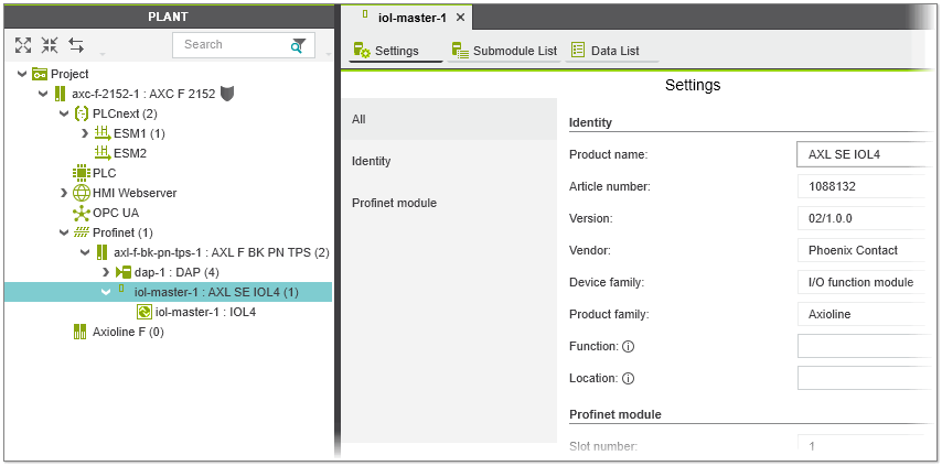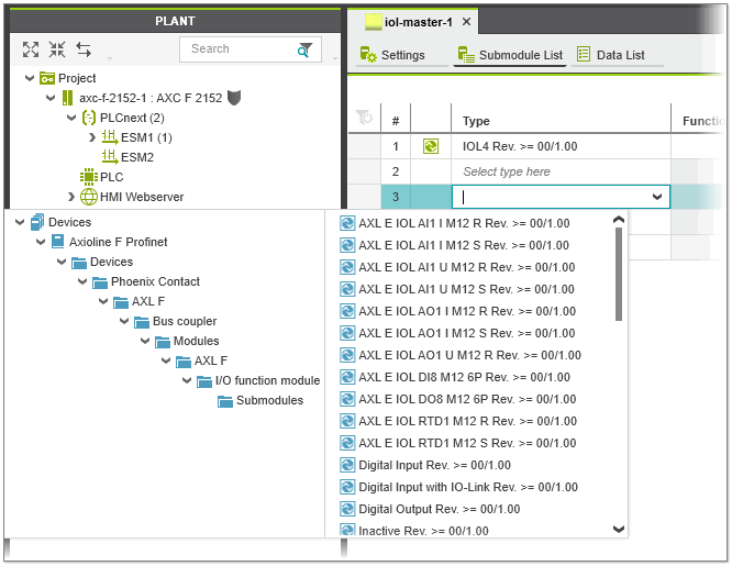2. In the PLANT, double-click the IO-Link master under the Profinet bus coupler node and select the 'Submodule List' editor. The 'Submodule List' editor shows the list of the ports of the IO-Link master where each table row represents one IO-Link port.
