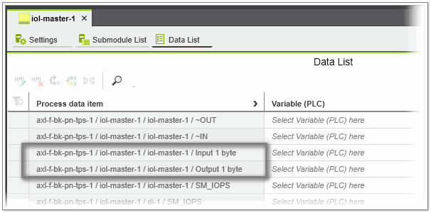 For a predefined digital input or digital output module, the corresponding process data are combined in one byte (process data items 'Input 1 byte' and 'Output 1 byte' as shown in the following example for the IO-Link master). The bit position in the byte corresponds to the slot number or physical connection of the I/O device.