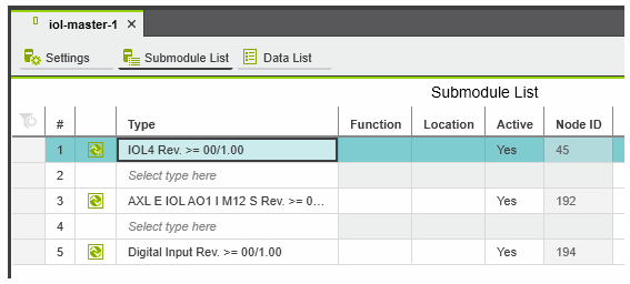 The ports of the IO-Link master can be operated in different operation modes. For each IO-Link port, the operation mode is configured by assigning a device (IO-Link device, DI or DO module) via the master's 'Submodule List' editor.