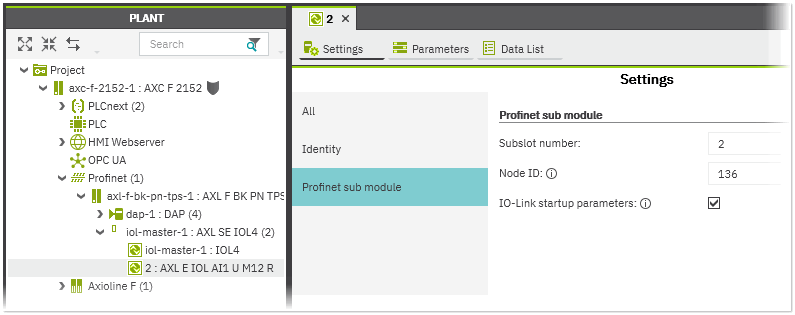 • In the PLANT, the IO-Link device appears as submodule of the IO-Link master with the corresponding port number preceding the device name. Double-clicking the node in the PLANT opens the corresponding editors in the editors area. Here you can parameterize the device and link the process data to the project variables.