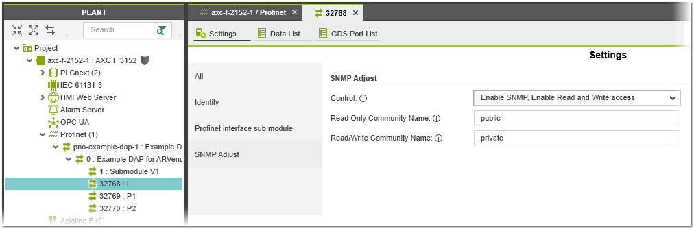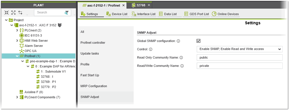 - Profinet I/O controller (master) under the 'SNMP Adjust' category. The SNMP parameters configured here are used as global settings for the entire Profinet I/O system (Profinet master and underlaid device submodule interfaces; see the following note).