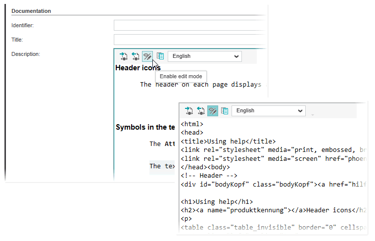 Documentation editorAllows you to enter information on the project, POU, or symbol, using either the Rich Text Format editor or the HTML editor and create HTML5 help files for function/function block POUs.