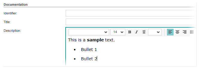 The Rich Text Format editor is an easy-to-use editor that allows you to format your text, add tables and lists, and insert content such as images to the documentation. The editor provides typical text formatting options including font, font size, weight, font color, alignment, etc.
