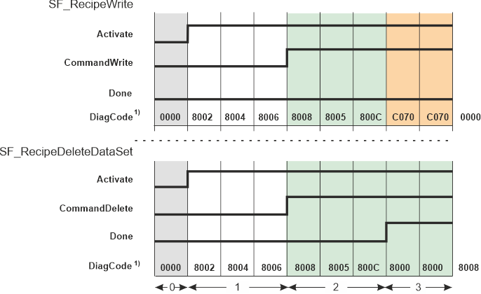 | 3 | SF_RecipeDeleteDataSet has validated the data and completed its operations successfully. Output Done switches to SAFETRUE (DiagCode = 8000).The validation of SF_RecipeWrite, however, is not successful as the written data set has been deleted meanwhile. Output Done remains SAFEFALSE and output DiagCode shows C070. |