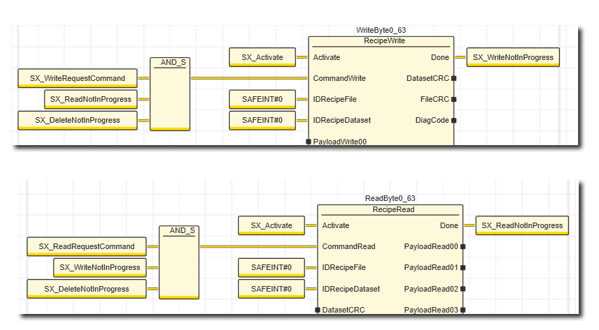 To prevent competing and thus faulty read/write access by several instances of FBs to a recipe file, you should prevent the simultaneous triggering of the FB execution in the safety application. The following illustration shows a simple possibility: The AND_S functions are used to ensure that the signals at the inputs CommandWrite (SF_RecipeWrite FB) and CommandRead (SF_RecipeRead FB) cannot switch to SAFETRUE at the same time.