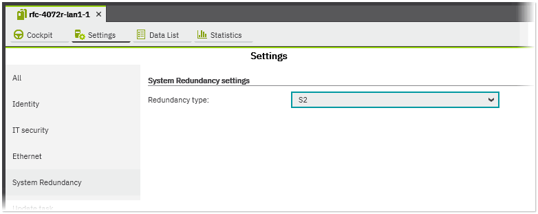 The RFC 4072R supports Profinet System Redundancy S2. The redundancy function is enabled by default in the 'System Redundancy' category in the controller's 'Settings' editor and cannot be disabled.