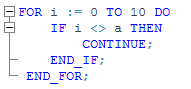 In ST code, the CONTINUE statement can only be used to abort the execution of an iteration statement (FOR, WHILE, REPEAT).