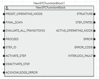 PLCnext Engineer extends the IEC 61131-3 standard by implementing SFC operating modes used to control the execution of the SFC code. For that purpose, each SFC function block gets formal parameters by default when it is inserted into a code worksheet.