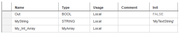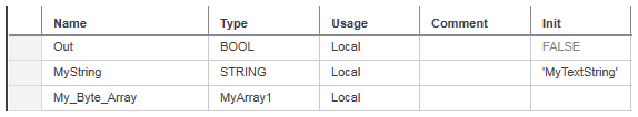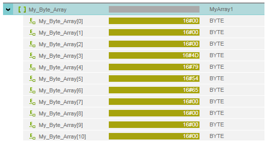In the following example, four characters (set by CNT = UDINT#4) of the input string 'MyTextString' are copied to the array variable My_Byte_Arrray (Byte array with a total length of 10). Copying the first character 'M' (=16#4D) of the input string starts at array index [3] (BUF_OFF = 3 x SIZEOF(BYTE) = 3). The second character 'y' (=16#79) is copied to the second byte and so on.