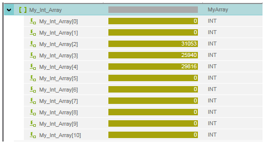 In the following example, six characters (set by CNT = UDINT#6) of the input string 'MyTextString' are copied to the array variable My_Int_Array (INT array with a total length of 10). Copying the first character of the input string starts at array index [2] (BUF_OFF = 2 x SIZEOF(INT) = 4).