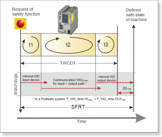 Depending on the SFRTmax, you must determine the resulting maximum monitoring/watchdog times as an upper limit for each individual safety function. If, for example, the WD of a safety-related output device is set higher than the device actually needs for processing the output signal, a time delta Δt results which must be considered when planning the safety system.