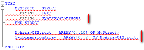- In the third error case, the message is reported three times because the two dimensional array is based on MyArrayOfStruct which has a recursive dependency with MyStruct.