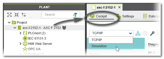 - You perform the same steps in PLCnext Engineer as you would if you were working with the physical network, although you must ensure that the 'Simulation' entry is selected in the 'Cockpit' editor of the controller node in the PLANT. While simulating the application, you can force variables or display online values in the editors as usual.