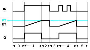 • The Q output remains unchanged, if the IN input switches from TRUE to FALSE before the specified delay time has elapsed or if the input becomes TRUE for a second time before the delay time has elapsed.