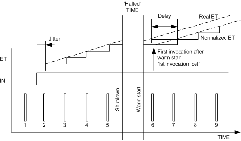Because the algorithm is based on a non retentive internal system tick counter, it is important to take notice of the problem, which we call 'lost invocation'. The figure below describes the behavior of the function block before and after a warm start is forced. After the parameter IN raised to TRUE, the next invocation detects the raising edge state of IN. At this point, the calculation begins with ET (elapsed time) := 0. After a warm restart, the next invocation detects the changed state and normalizes the internal start value by subtracting the current system counter with the internal retentive elapsed counter. That is why the time distance to the previous invocation is 0. Related to the 'real' elapsed time there is a delay dependent from the duration between successive invocations of the function block. That means, after a warm start the duration of the function block is at worst one invocation distance slower than a function block where no warm restart occurs.