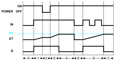The algorithm is based on incrementing time distances between two invocations of the function block. The function block is capable to calculate the elapsed time after a warm restart beginning from the last invocation. The time distance is measured by using an internal system tick counter (contains the amount of time in milliseconds). The preset timer value (PT) is limited at 2,147,483,647 milliseconds for the *_R function block (max range of DINT data type) and 9,223,372,036,854,775,807 for the *_R_LTIME function block (max. range of the LINT data type).